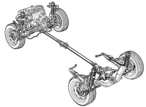 För att åstadkomma detta finns den vanliga framhjulsdriften, och en bakaxel med differtial (eller diff), samt en axel som knyter ihop diffen med växellådan. Det ser lite ut som i bilden.