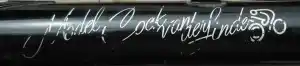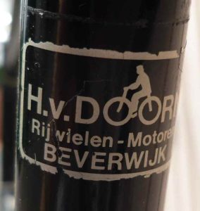 …getuige een sticker ‘Model Cock van der Linde’ op het frame van een Engelse fietser. De fiets heeft ook nog het toemalige bedrijfslogo: