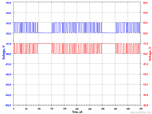 Som det framgår i bilden, är CAN-high signalen mellan 2V och 3V medan CAN-low signalen mellan 1V och 0V.