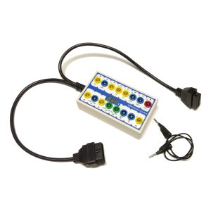 This box connects to the car’s ODB2 contact and in many cases provides for an additional ODB2 contact. This allows for a scantool to be connected while using the breakout box.